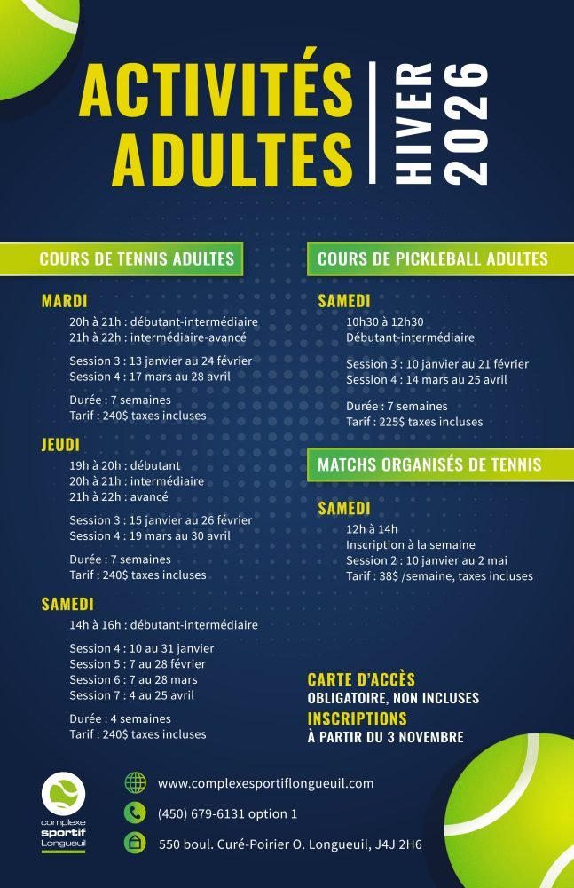 Il est maintenant possible pour les joueurs de profiter d’options d’activités avantageuses. Le Complexe Sportif Longueuil vous propose des activités pour enfants et adultes adaptés au niveau des joueurs. Vous pouvez également organiser vos propres activités : entraînement individuel ou en groupe, ligues de compétitions, matchs entre amis, tournois amicaux, etc. De plus, vous pouvez être accompagnés par un de nos professionnels certifiés. Nos professionnels se feront un plaisir de vous transmettre leur passion!